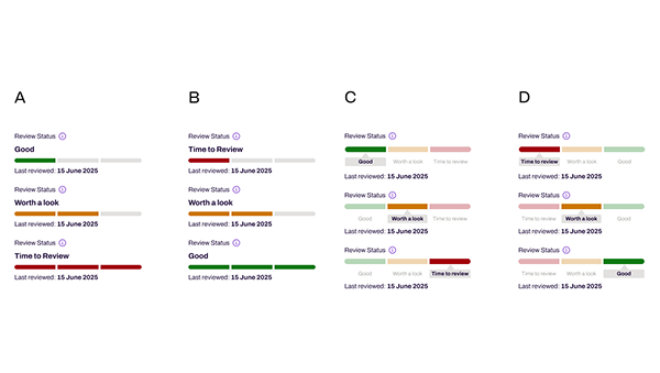 The disagreement was about colour. I wanted red at the low end of the gauge; the urgency signal, the prompt to act. Jesse wanted green. Her logic was that users scanning quickly would read green as safety and red as danger; which is the opposite of what we wanted if their score was genuinely poor.