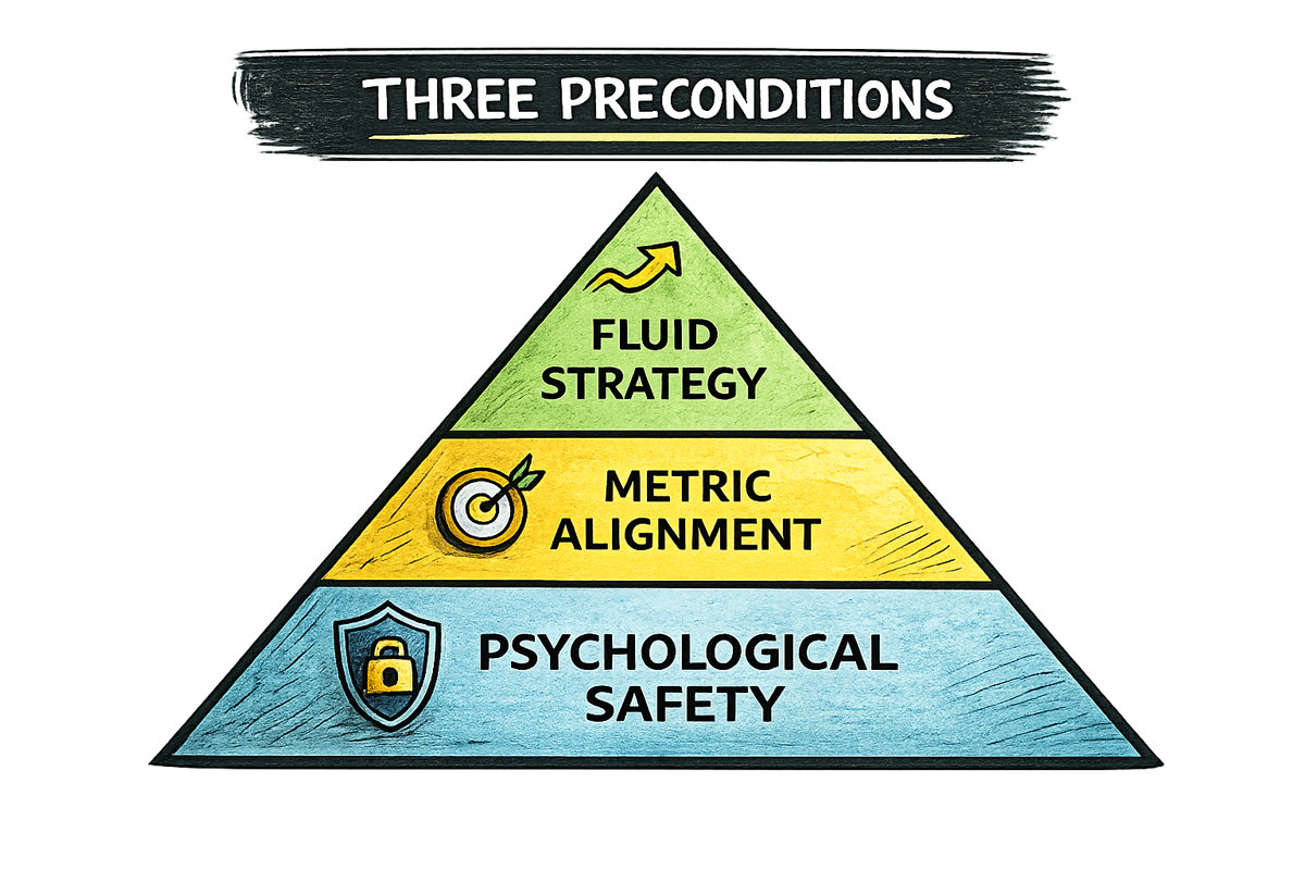 1. Psychological safety as infrastructure. The PM who needs to stop a flawed test sits one level below a manager. That manager sits below a CPO. The CPO sits below a CEO. For the PM to pause, he needs to believe his manager will back him. For the manager to back him, the CPO can't punish the delay. For the CPO to absorb it, the CEO can't read it as a lack of execution discipline. It's fractal; the same trust structure repeats at every level. Break it at any point and the insight stops propagating upward. It stays local, gets noted, gets filed. The loop never closes.
