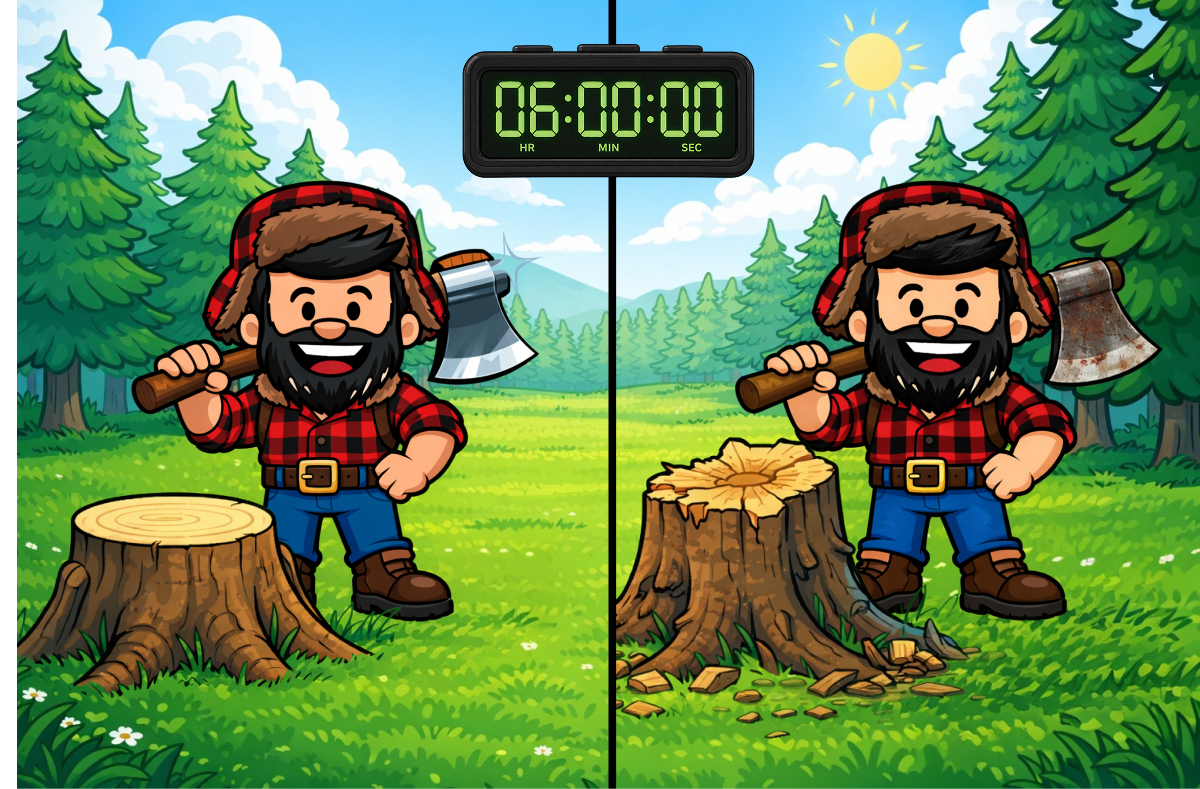 The point isn't that sharpening is more important than chopping. It's that chopping with a blunt axe for ten hours produces a worse result than sharpening for four and chopping for six — in the same total time.