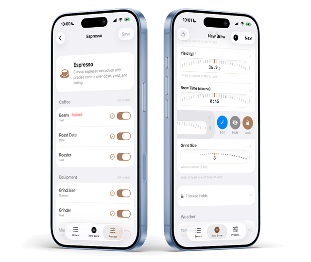 Many brewing tools treat the experience as a logging exercise: open an app, enter numbers, review results. In practice, this breaks the natural flow of making coffee.