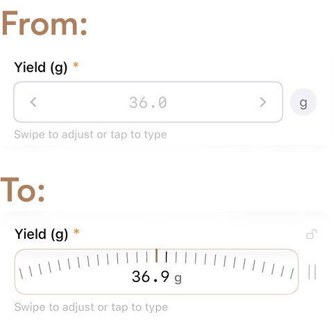 Every brewing parameter—dose, yield, grind adjustments—was entered through text fields. To log a brew, users had to tap a field, edit the value, confirm it, and move to the next one.