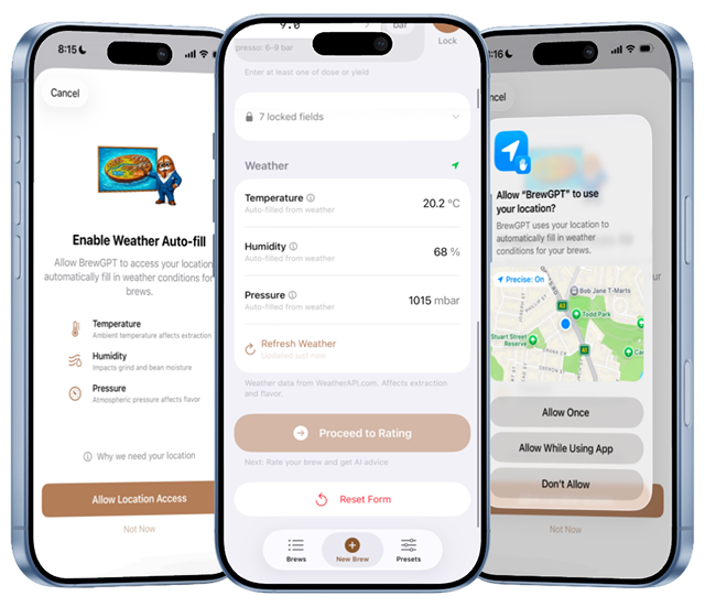 The app captures local weather conditions—particularly humidity and temperature—alongside brewing parameters. This allows the system to contextualize each brew within the environment in which it occurred.