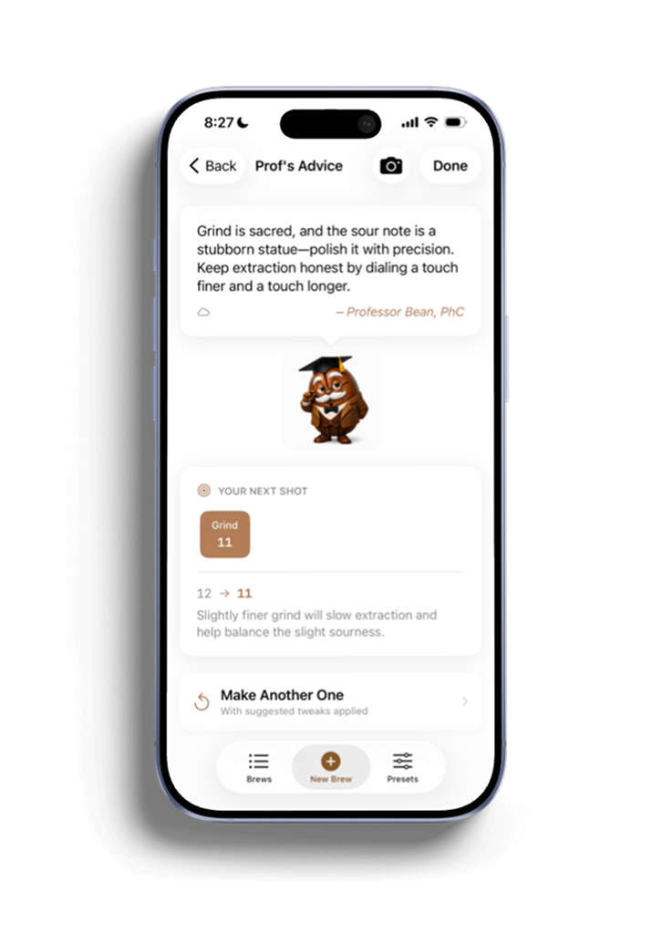 By treating coffee as a dynamic system influenced by its surroundings, Professor Bean helps users understand that dialing in coffee is not about finding one perfect setting—it is about learning how to adapt confidently as conditions evolve.