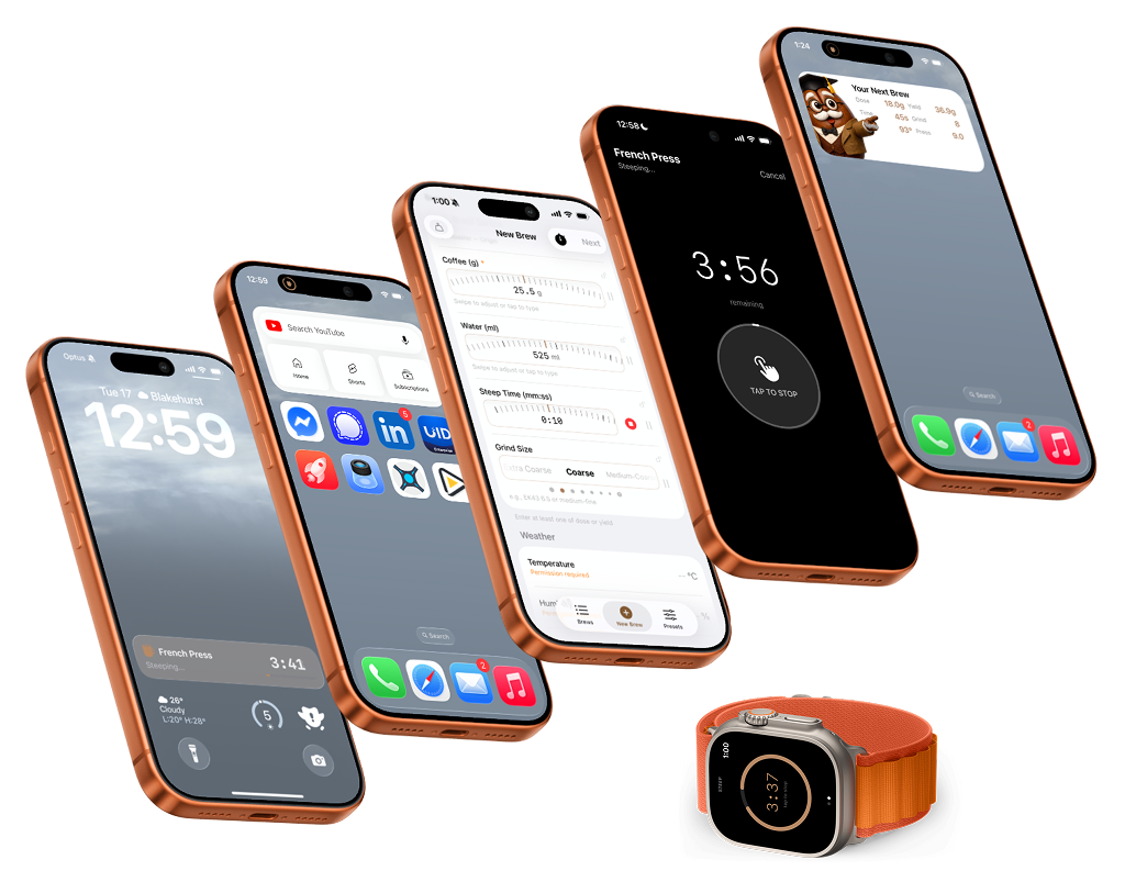 The experience extends beyond the app itself into a synchronized system that includes Apple Watch, lock screen controls, live timers, and Home Screen widgets. Rather than requiring users to stop what they are doing and return to a single interface, Professor Bean keeps the brewing state visible wherever it is most useful.