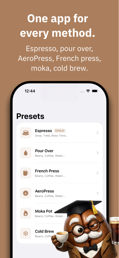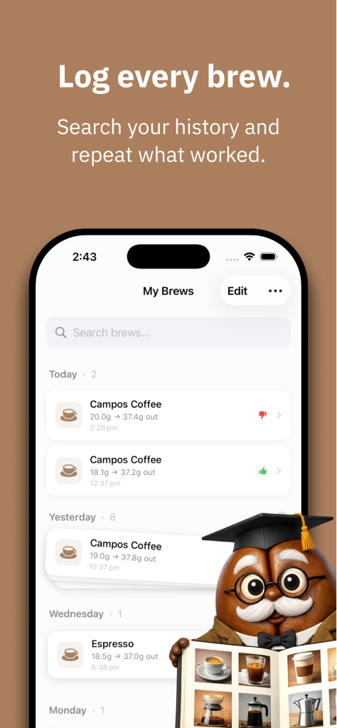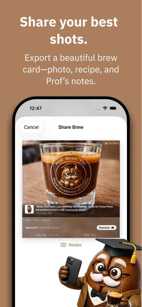 Over time, Professor Bean becomes something users see every day—not just when they open the app, but through widgets that quietly surface brewing guidance from the moment the phone wakes. This reinforces the habit of reflection and keeps the next best adjustment close at hand, allowing the product to become part of the ritual rather than a tool used only after something goes wrong.