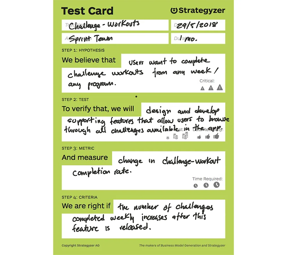 After agreeing on the design, we would then test it and refine it. Usability tests then would be linked to the Strategizer Test Card above, but I would outline the different ways the workflow could be engaged (golden path) and get the usability test written. If necessary, insights then would inform a series of changes to be done in the design, which would get retested.