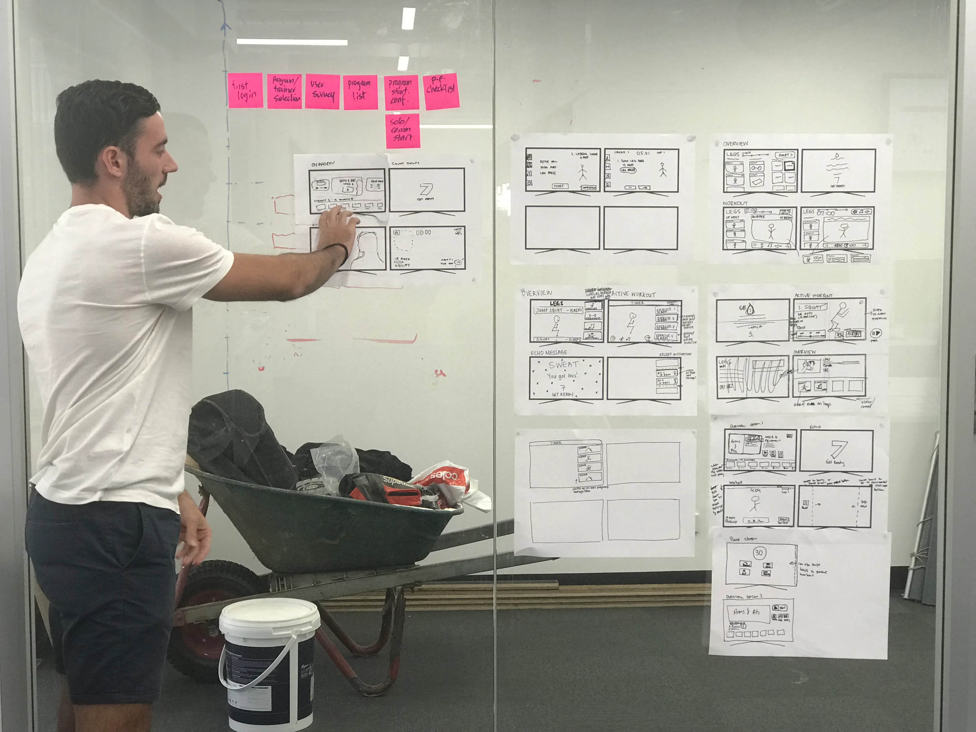 The foundation of a sprint was set during its first day, where we would focus our energy in understanding what needed to be done. This usually came in the form of 'how can we' statements (as in: how can we streamline the on-boarding process of the app), and a number of screens that were likely to be affected by this change.