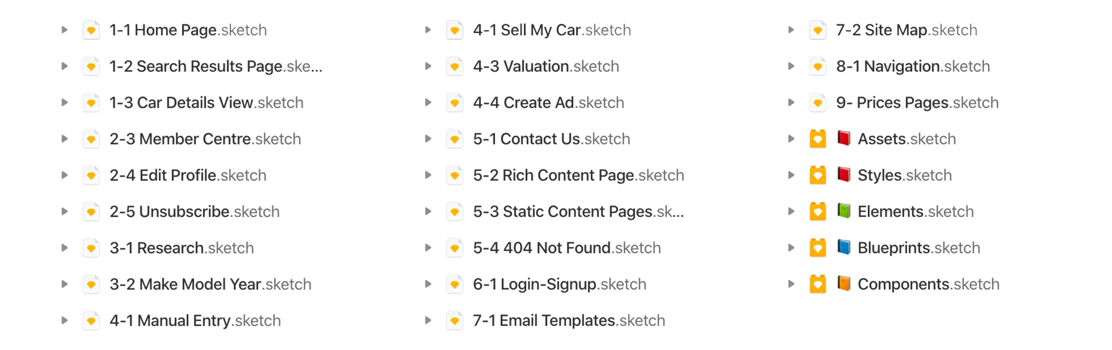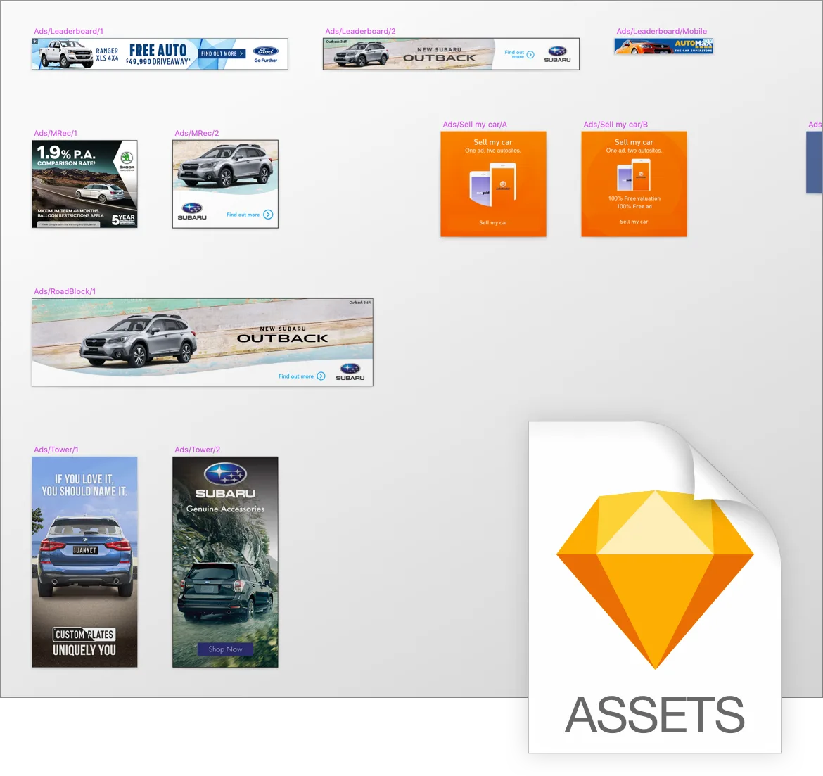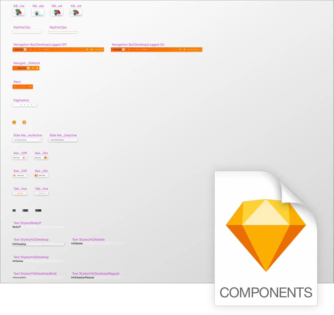 There are two kinds of pages in 📕Assets.sketch. Icons and Images. For example. Autotrader's File was organised in four different pages: