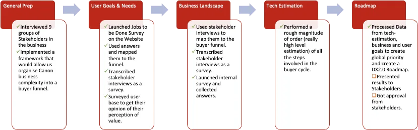 The goal of this case study is to document the work done in Canon to create a User Centred Roadmap that was going to deliver the most impact to the business. Product Design Sprints (Scrum) are in its own case study for readability purposes.