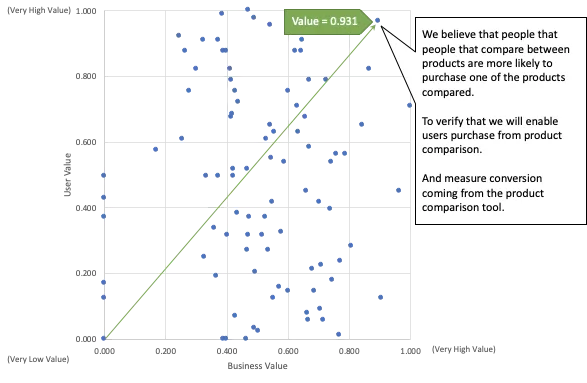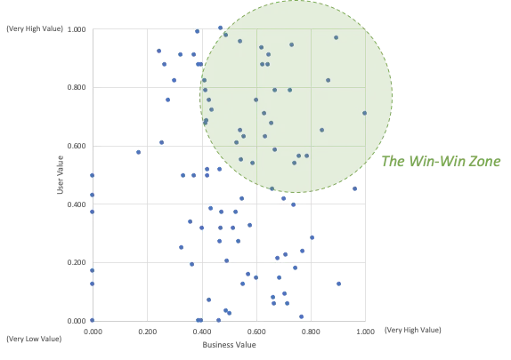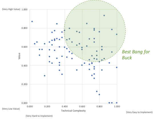 In order to make it more human-readable, the following two charts compound User and Business Value into one axis: Value. Then Value is mapped against Ease of Implementation.