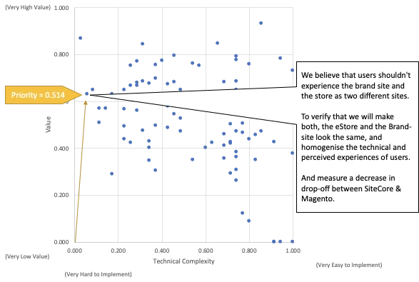 The outcome of the tech session allowed us to add Technical Complexity to the mix, which makes a 3D scatterplot that behaves in the same way than the 2D version of Value. And it looked like this.