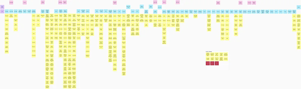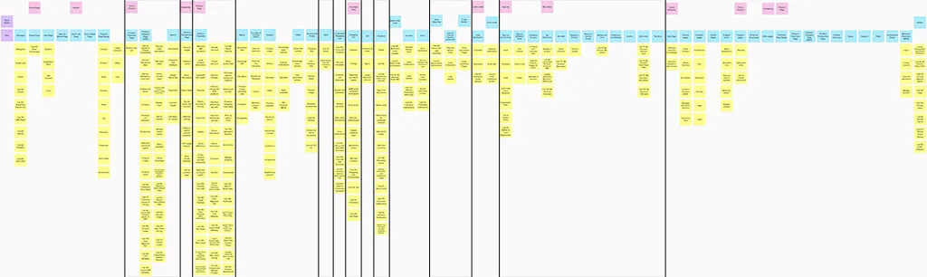 After all these workshops, my team and I cleaned up he journey by (1) removing duplicate sticky notes and those with style differences but with the same meaning and then (2) segmenting the journey in 7 different stages and three swim-lanes.