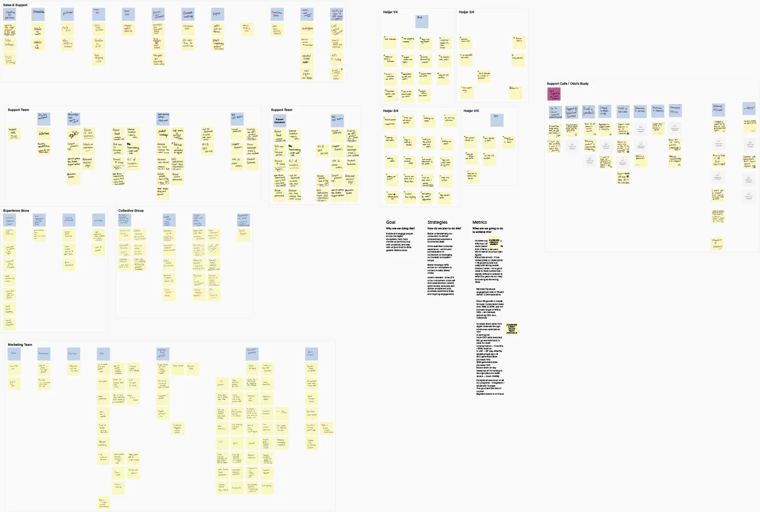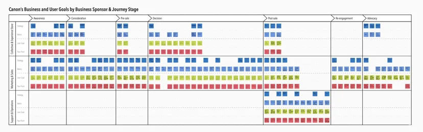 We also rewrote each of the sticky notes trying to ask ourselves what would that do for the business and what would that do for the user. Similar to what I've done in Discovery in Musica Viva or Discovery in Gavelytics, but in a more sophisticated way that allowed the team to visualise and work with the strategies and metrics for the complex business landscape in which Canon operates.