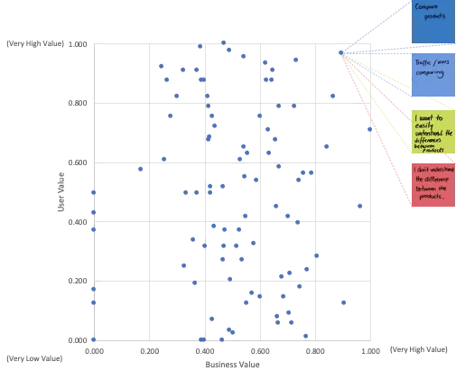 The result of the exercise above was a scatterplot that allowed us to see all the sets of sticky notes with a value ranging from 0 to 1.