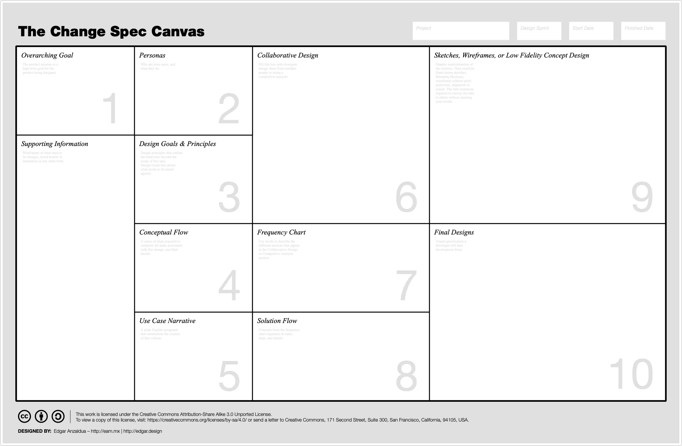 The Change Spec Canvas is a board, the likes of the Business Model Canvas or the Lean UX Canvas. If you aren't familiar with them, check out the following links.